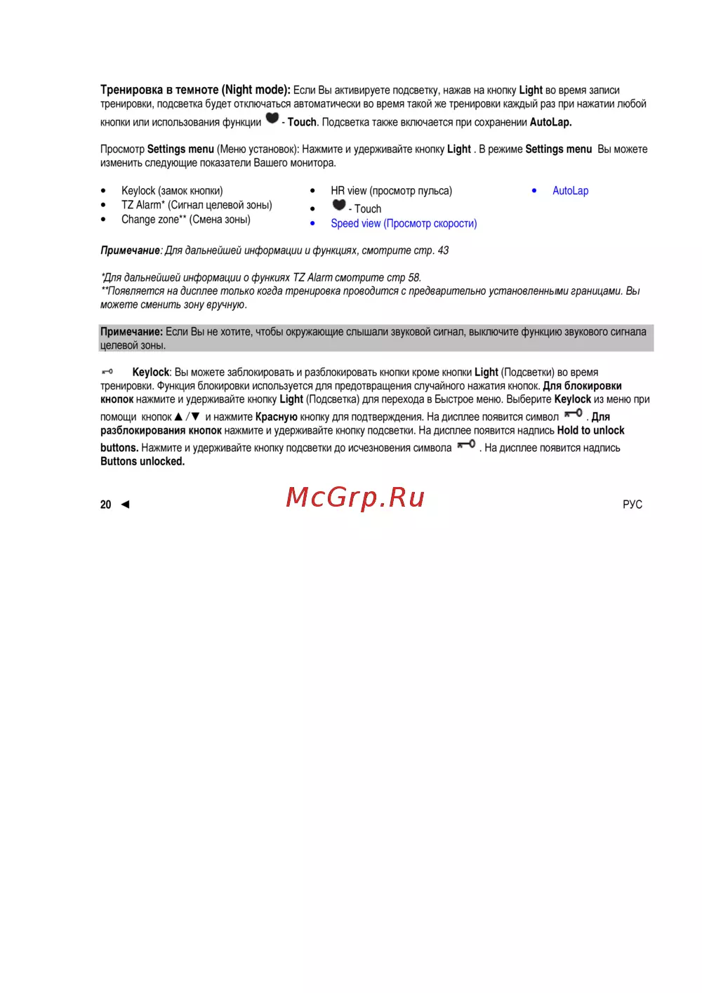 тренировки. Функция блокировки используется для предотвращения случайного нажатия кнопок. Для блокировки