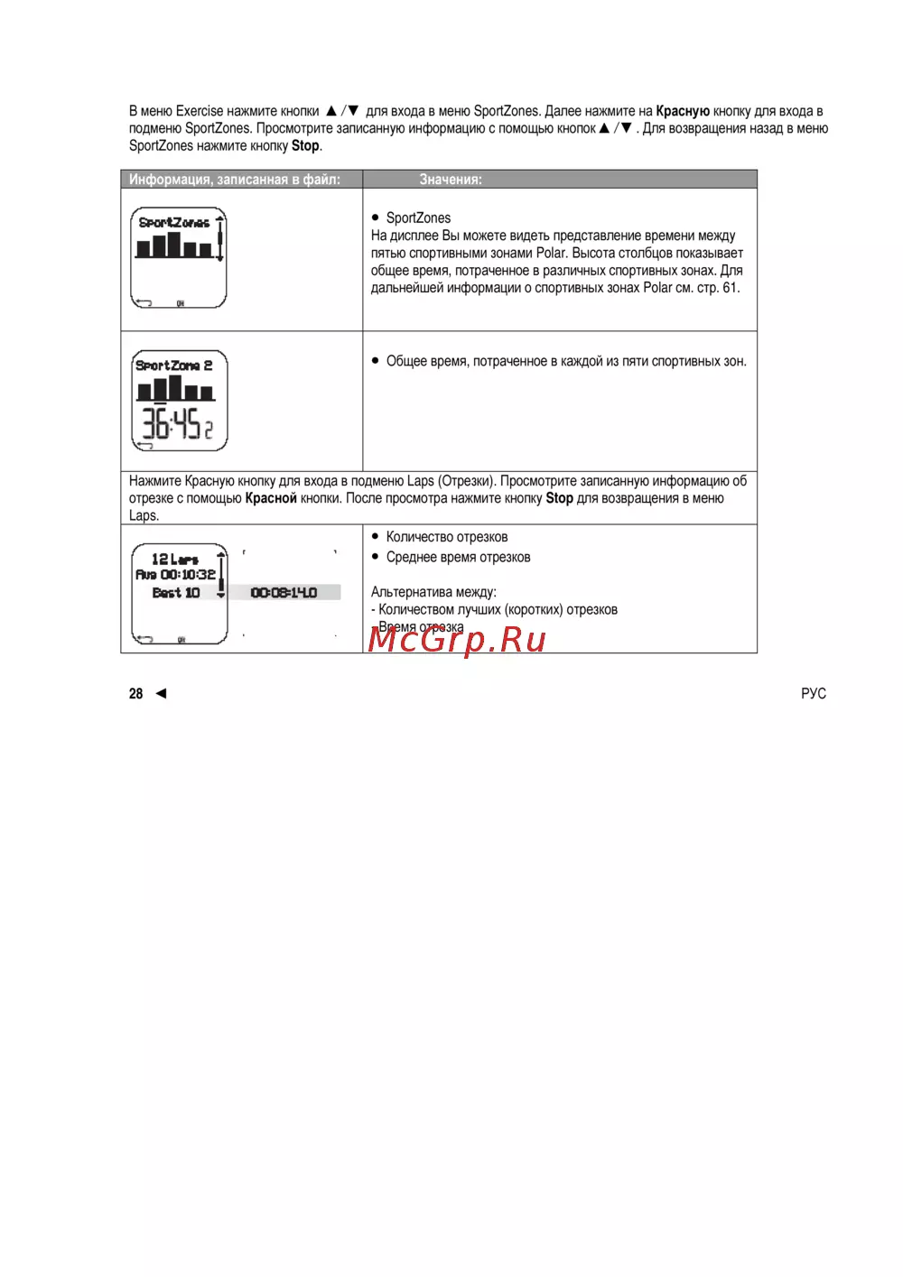 подменю SportZones. Просмотрите записанную информацию с помощью кнопок ▲/ ▼. Для возвращения назад в меню