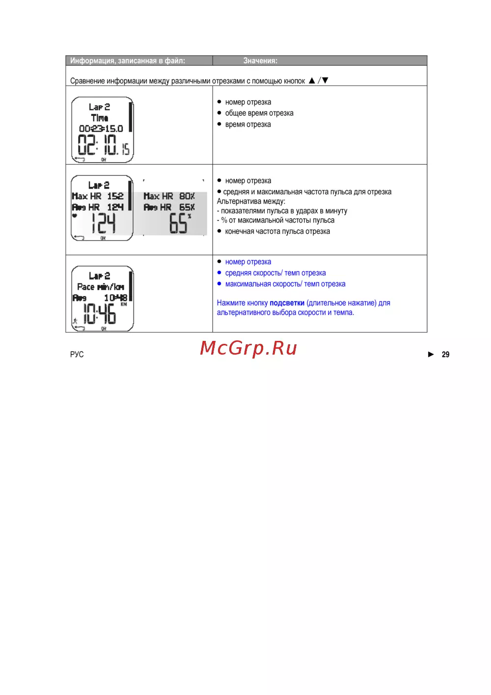 - Изменение информации демонстрируемой на дисплее во время тренировки p.17