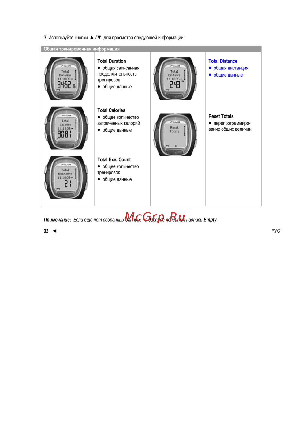 Polar RS300 — общая информация о тренировках: продолжительность, калории и дистанция [33/83]