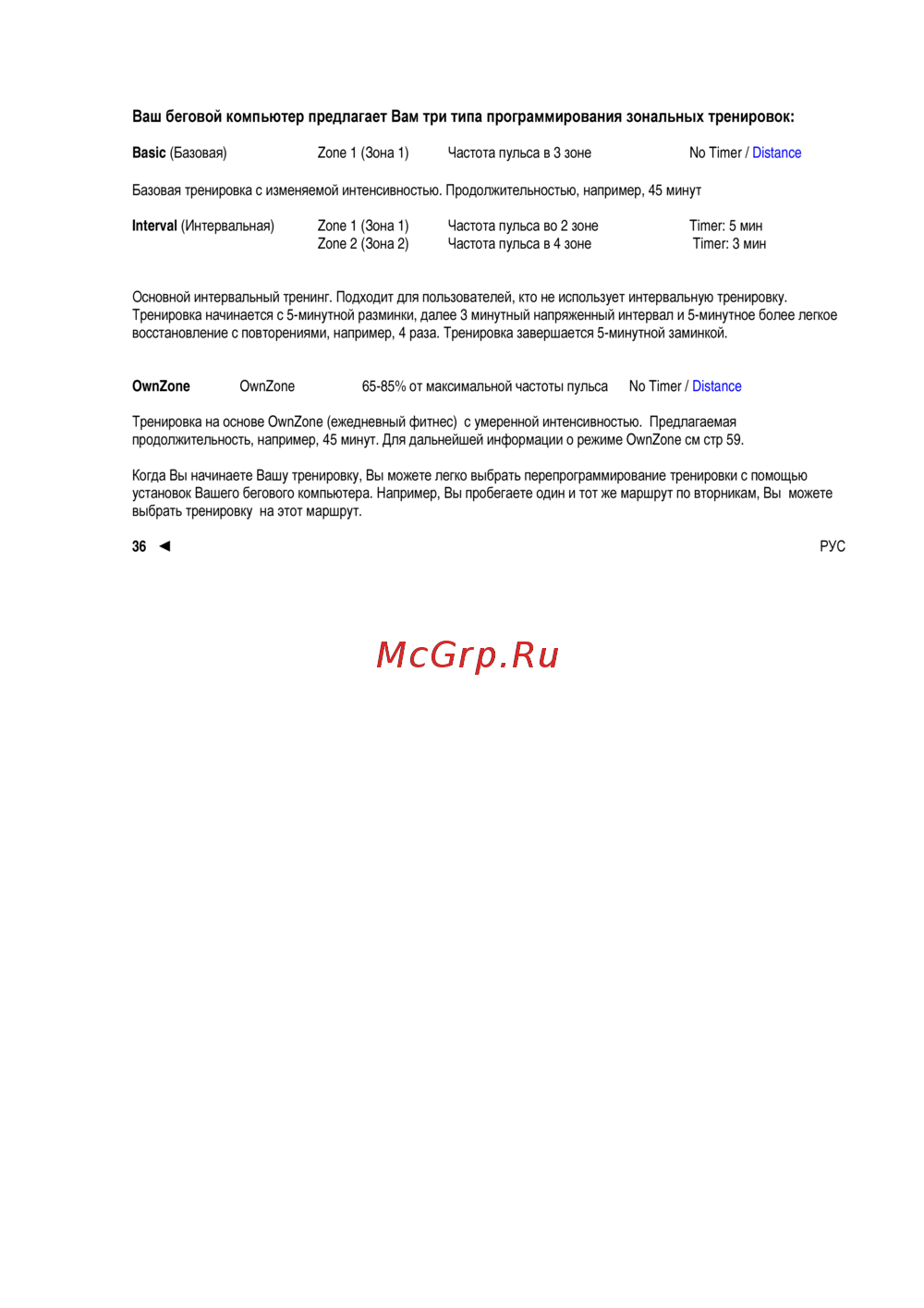 OwnZone OwnZone 65-85% от максимальной частоты пульса No Timer / Distance