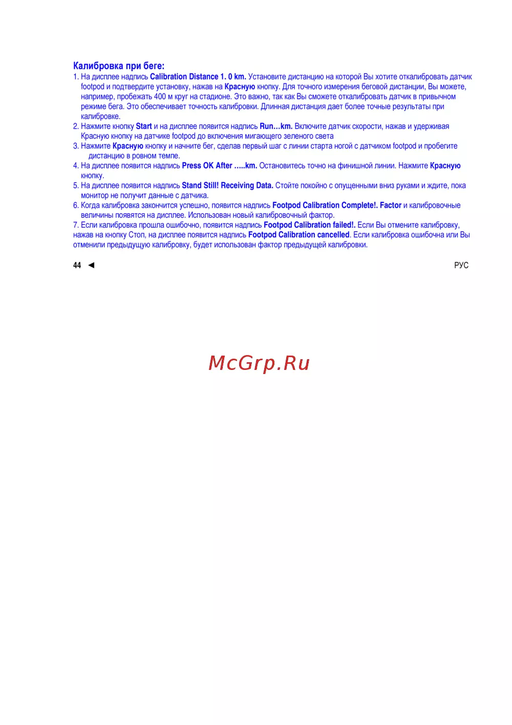 нажав на кнопку Стоп, на дисплее появится надпись Footpod Calibration cancelled. Если калибровка ошибочна или Вы