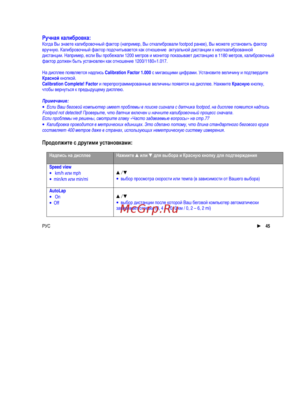 дистанции. Например, если Вы пробежали 1200 метров и монитор показывает дистанцию в 1180 метров, калибровочный