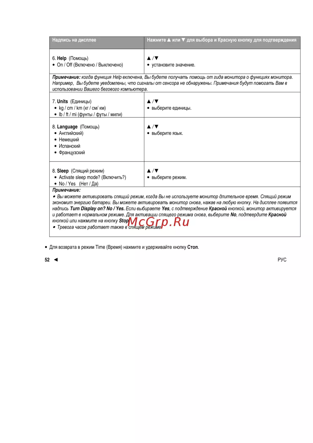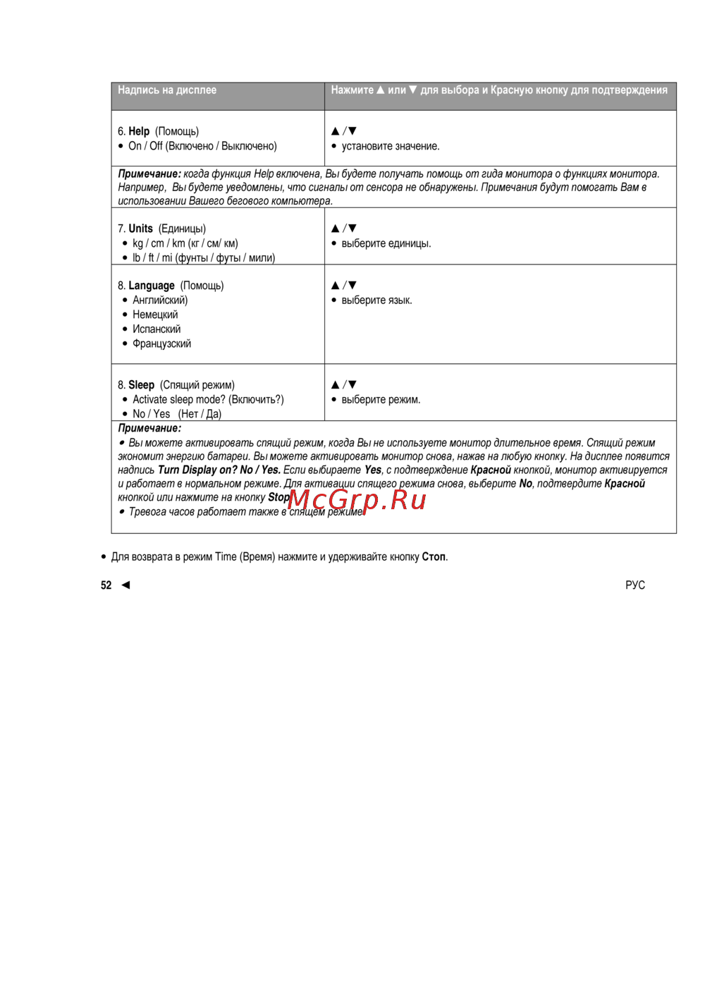 - Изменение информации демонстрируемой на дисплее во время тренировки p.17