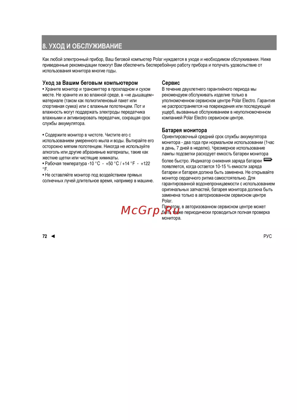 Как любой электронный прибор, Ваш беговой компьютер Polar нуждается в уходе и необходимом обслуживании. Ниже