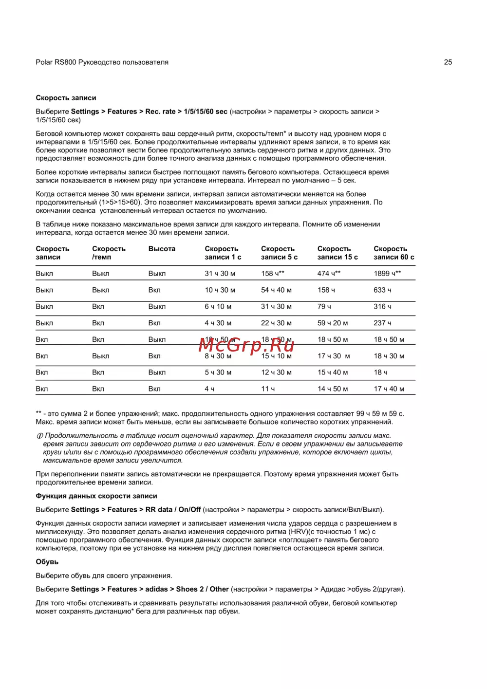 Макс. время записи может быть меньше, если вы записываете большое количество коротких упражнений.