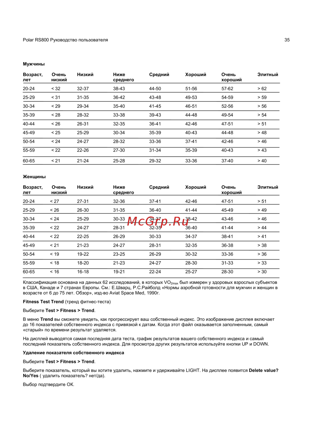 Polar RS800CX — руководство пользователя по фитнес-тестам и классификации индексов [35/53]