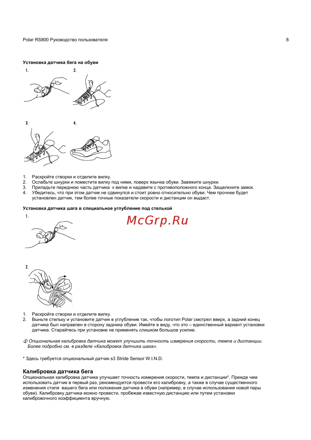 обуви). Калибровку датчика можно провести, пробежав известную дистанцию или путем