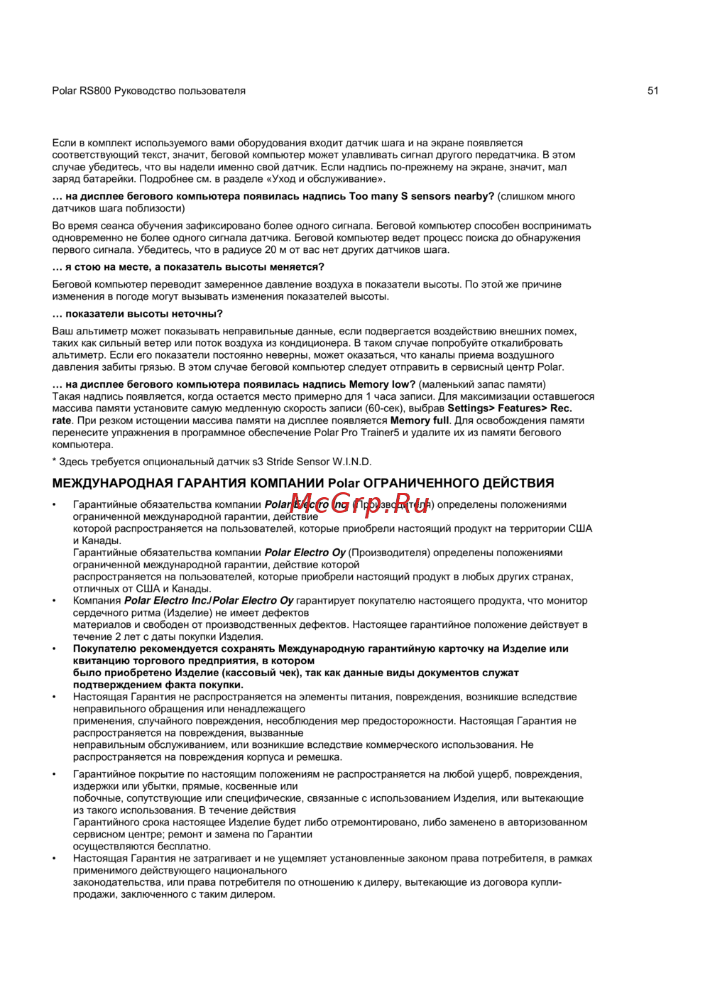 • Гарантийные обязательства компании Polar Electro Inc. (Производителя) определены положениями