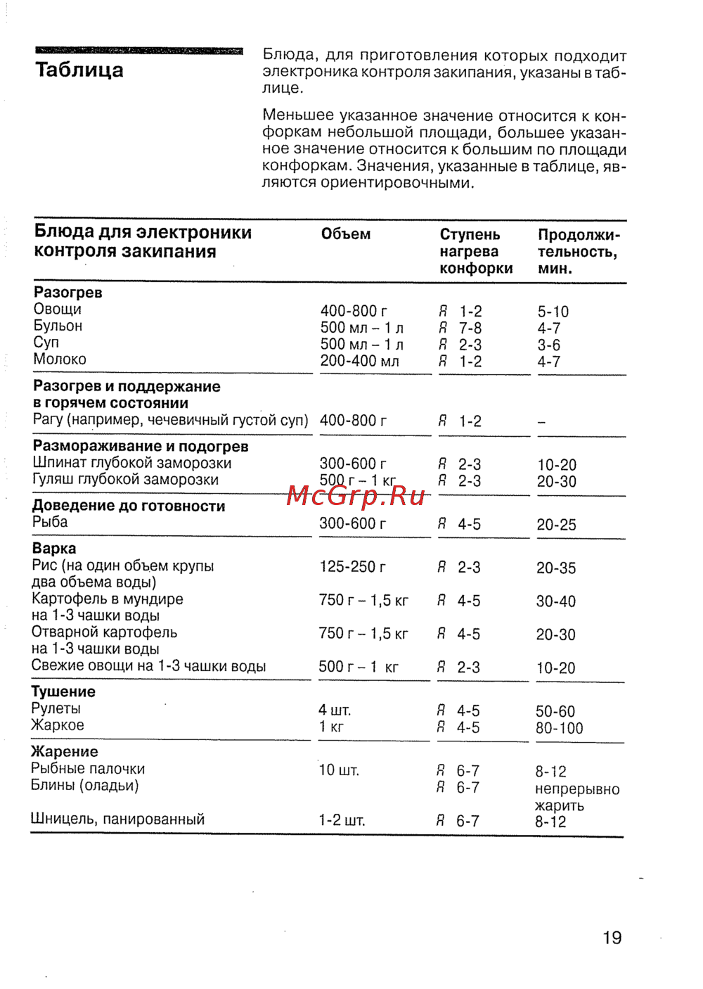 Таблица Блюда для приготовления которых подходит электроника контроля закипания указаны в таб лице Меньшее указанное значение относится к кон форкам небольшой площади большее указан ное значение относится к большим по площади конфоркам Значения указанные в таблице яв ляются ориентировочными Блюда для электроники контроля закипания Объем Ступень нагрева конфорки Продолжи тельность мин 400 800 г 500 мл 1 л 500 мл 1 л 200 400 мл Я 1 2 R 7 8 Я 2 3 R 1 2 5 10 4 7 3 6 4 7 Разогрев и поддержание в горячем состоянии Рагу например чечевичный густой суп 400 800 г R 1 2 Размораживание и подогрев Шпинат глубокой заморозки Гуляш глубокой заморозки 300 600 г 500 г 1 кг Я 2 3 R 2 3 10 20 20 30 Доведение до готовности Рыба 300 600 г R 4 5 20 25 125 250 г R 2 3 20 35 750 г 1 5 кг Я 4 5 30 40 750 г 1 5 кг Я 4 5 20 30 500 г 1 кг Я 2 3 10 20 4 шт 1 кг Я 4 5 R 4 5 50 60 80 100 Жарение Рыбные палочки Блины оладьи 10 шт R 6 7 Я 6 7 Шницель панированный 1 2 шт Я 6 7 8 12 непрерывно жарить 8 12 Разогрев Овощи Бульон Суп Молоко Варка Рис на один объем крупы два объема воды Картофель в мундире на 1 3 чашки воды Отварной картофель на 1 3 чашки воды Свежие овощи на 1 3 чашки воды Тушение Рулеты Жаркое 19
