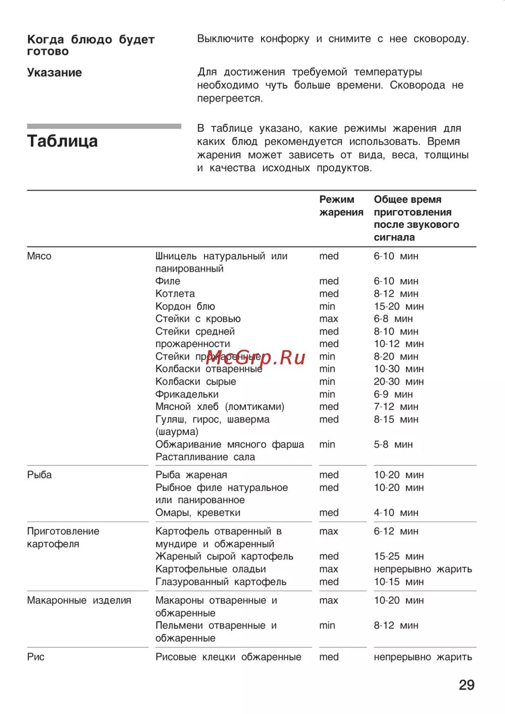 Когда блюдо будет готово Выключите конфорку и снимите с нее сковороду Указание Для достижения требуемой температуры необходимо чуть больше времени Сковорода не перегреется Таблица Мясо Рыба Приготовление картофеля Макаронные изделия Рис В таблице указано какие режимы жарения для каких блюд рекомендуется использовать Время жарения может зависеть от вида веса толщины и качества исходных продуктов Режим жарения Общее время приготовления после звукового сигнала тес 6 10 мин тес тес т п тах тес тес т п т п т п т п тес тес 6 10 мин 8 12 мин 15 20 мин 6 8 мин 8 10 мин 10 12 мин 8 20 мин 10 30 мин 20 30 мин 6 9 мин 7 12 мин 8 15 мин т п 5 8 мин Рыба жареная Рыбное филе натуральное или панированное Омары креветки тес тес 10 20 мин 10 20 мин тес 4 10 мин Картофель отваренный в мундире и обжаренный Жареный сырой картофель Картофельные оладьи Глазурованный картофель тах 6 12 мин тес тах тес 15 25 мин непрерывно жарить 10 15 мин Макароны отваренные и обжаренные Пельмени отваренные и обжаренные тах 10 20 мин т п 8 12 мин тес непрерывно жарить Шницель натуральный или панированный Филе Котлета Кордон блю Стейки с кровью Стейки средней прожаренности Стейки прожаренные Колбаски отваренные Колбаски сырые Фрикадельки Мясной хлеб ломтиками Гуляш гирос шаверма шаурма Обжаривание мясного фарша Растапливание сала Рисовые клецки обжаренные 29