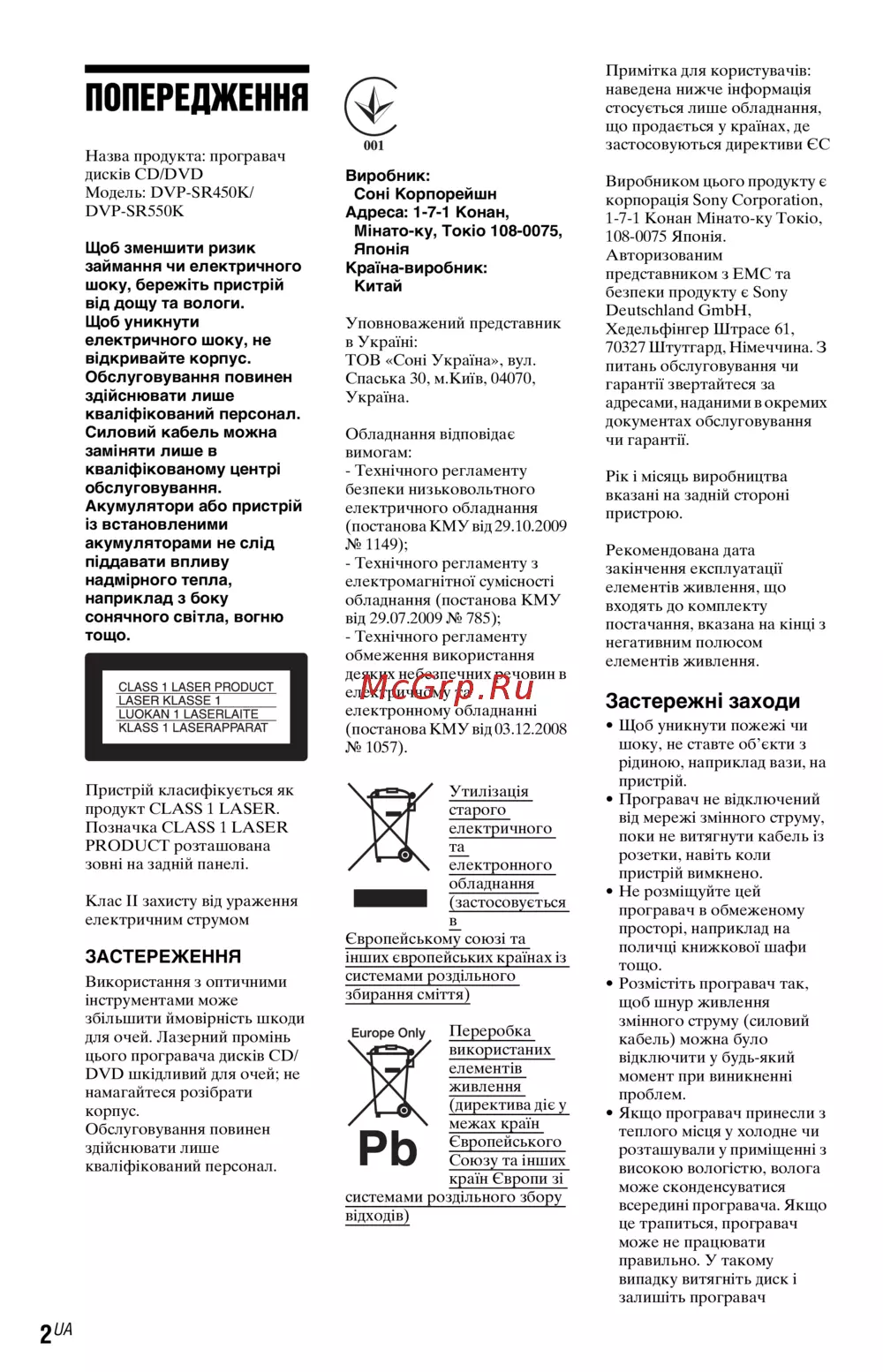 ![Sony DVP-SR450K [16/44] Попередження](/views2/1158629/page16/bg10.png)