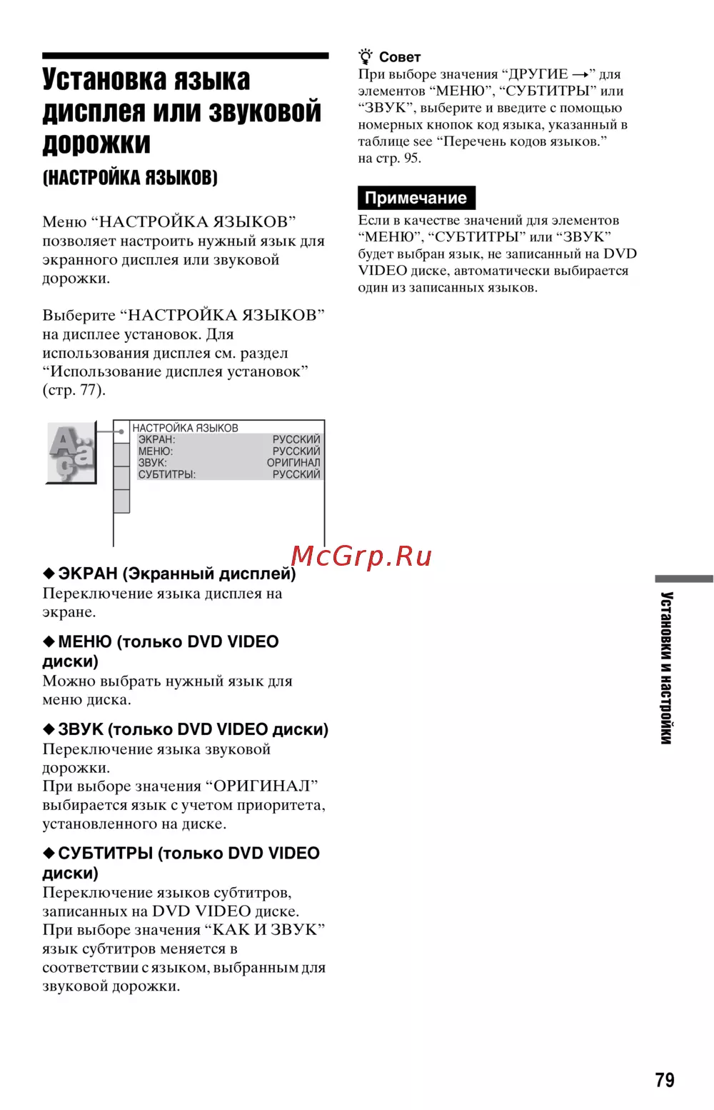 - Установка языка дисплея или звуковой дорожки настройка языков p.79