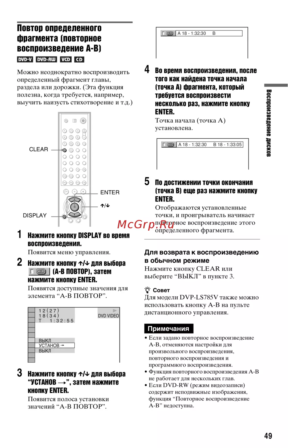 Sony DVP-NS955V/S [49/116] Повтор определенного фрагмента повторное воспроизведение a b