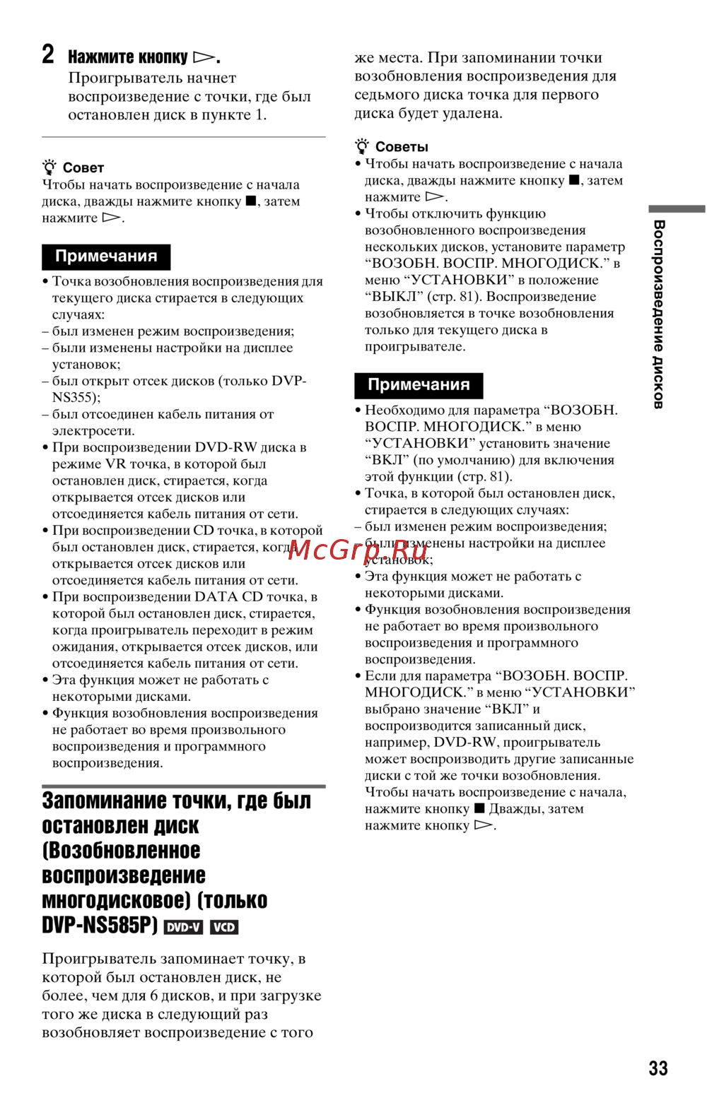 - Возобн воспр многодиск только dvd video video cd диски только dvp ns585p p.81