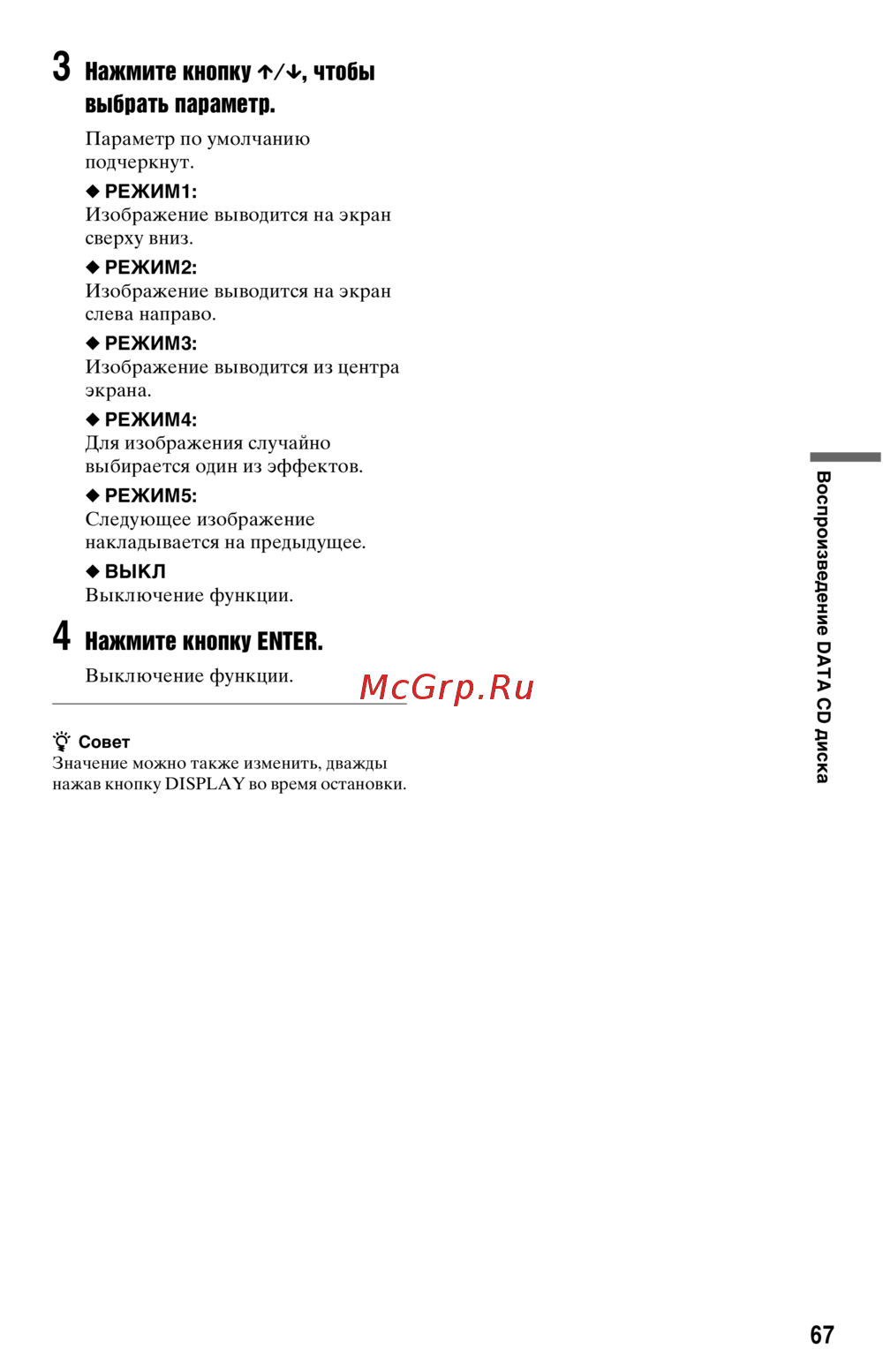 Узнайте о различных режимах воспроизведения DATA CD диска и как их настроить. Подробные инструкции по выбору эффектов и управлению изображениями.
