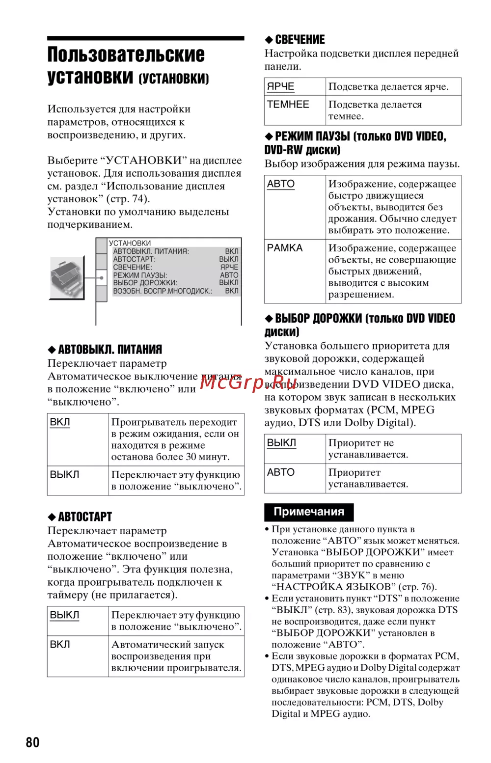 “ВЫКЛ” (стр. 83), звуковая дорожка DTS