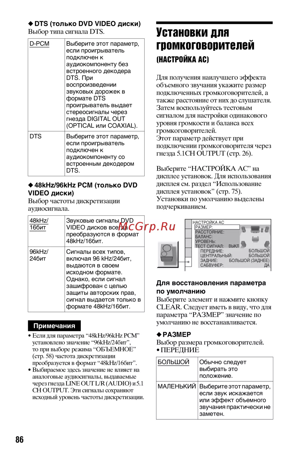 - Для получения наилучшего эффекта объемного звучания укажите размер подключенных громкоговорителей а также расстояние от них до слушателя затем воспользуйтесь тестовым сигналом для настройки одинакового уровня громкости и баланса всех громкоговорителей этот параметр действует при подключении громкоговорителя через гнезда 5 ch output стр 26 p.86