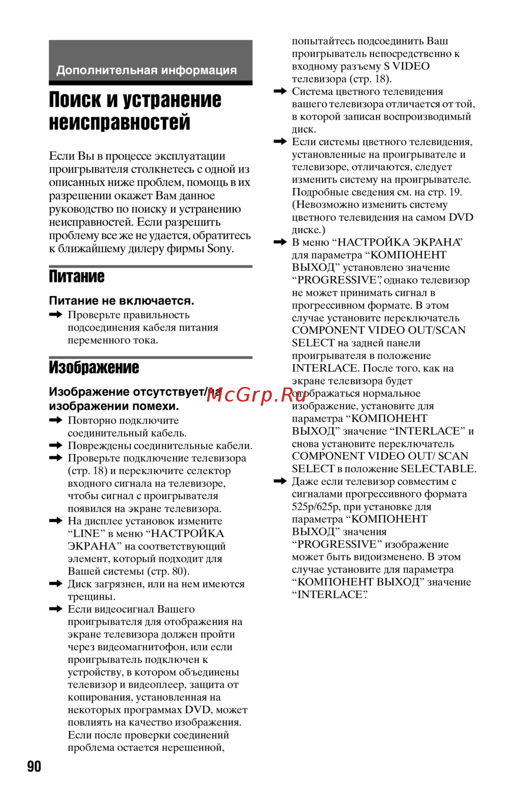 - Если вы в процессе эксплуатации проигрывателя столкнетесь с одной из описанных ниже проблем помощь в их разрешении окажет вам данное руководство по поиску и устранению неисправностей если разрешить проблему все же не удается обратитесь к ближайшему дилеру фирмы sony p.90
