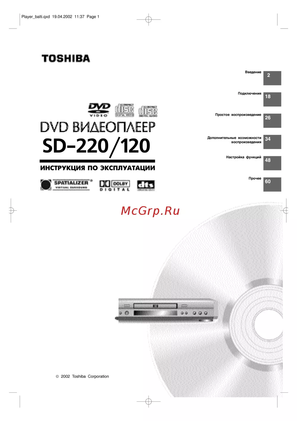 Player_balti qxd 19 04 2002 11 37 Pagel TOSHIBA DVD ВИДЕОПЛЕЕР SD 220 120 ИНСТРУКЦИЯ ПО ЭКСПЛУАТАЦИИ H 2002 Toshiba Corporation