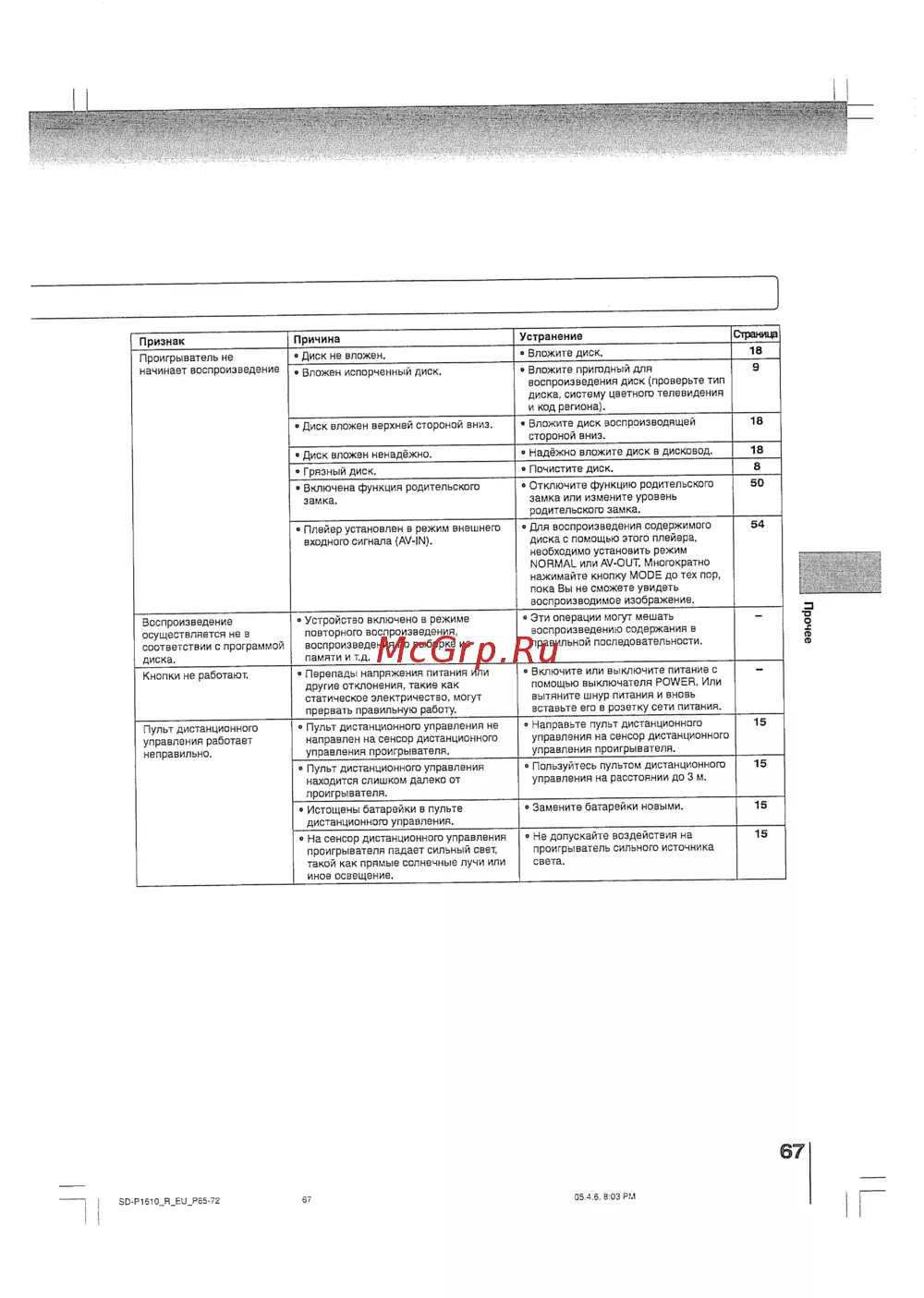 Признак Проигрыватель не начинает воспроизведение Причина Устранение Диск не вложен Вложите диск ____________ _____ Вложен испорченный диск Вложите пригодный для воспроизведения диск проверьте тип диска систему цветного телевидения Диск вложен верхней стороной вниз в Вложите диск воспроизводящей Зтранида 18 9 и код региона 18 стороной вниз Диск вложен ненадёжно Надёжно вложите диск в дисковод Грязный диск Почистите диск Включена функция родительского Отключите функцию родительского замка диска 8 50 замка или измените уровень родительского замка Плейер установлен в режим внешнего входного сигнала AV N Для воспроизведения содержимого диска с помощью этого плейера необходимо установить режим NORMAL или AV OUT Многократно нажимайте кнопку MODE до тех пор пока Вы не сможете увидеть воспроизводимое изображение о Устройство включено в режиме повторного воспроизведения воспроизведения по выборке из Эти операции могут мешать воспроизведению содержания в правильной последовательности 54 Прочее Воспроизведение осуществляется не в соответствии с программой 18 памяти и т д Кнопки не работают о Перепады напряжения питания или другие отклонения такие как статическое электричество могут прервать правильную работу Включите или выключите питание с помощью выключателя POWER Или вытяните шнур питания и вновь вставьте его в розетку сети питания Пульт дистанционного управления работает о Пульт дистанционного управления не направлен на сенсор дистанционного управления проигрывателя Направьте пульт дистанционного управления на сенсор дистанционного управления проигрывателя 15 о Пульт дистанционного управления Пользуйтесь пультом дистанционного управления на расстоянии до 3 м 15 Истощены батарейки в пульте дистанционного управления Замените батарейки новыми 15 На сенсор дистанционного управления проигрывателя падает сильный свет такой как прямые солнечные лучи или 0 Не допускайте воздействия на проигрыватель сильного источника 15 неправильно находится слишком далеко от проигрывателя света иное освещение 67 SD Pl610_R_EU_P65 72 05 4 6 8 03 PM