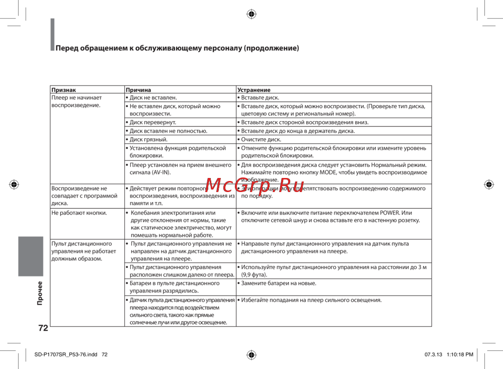 - Перед обращением к обслуживающему персоналу продолжение p.71