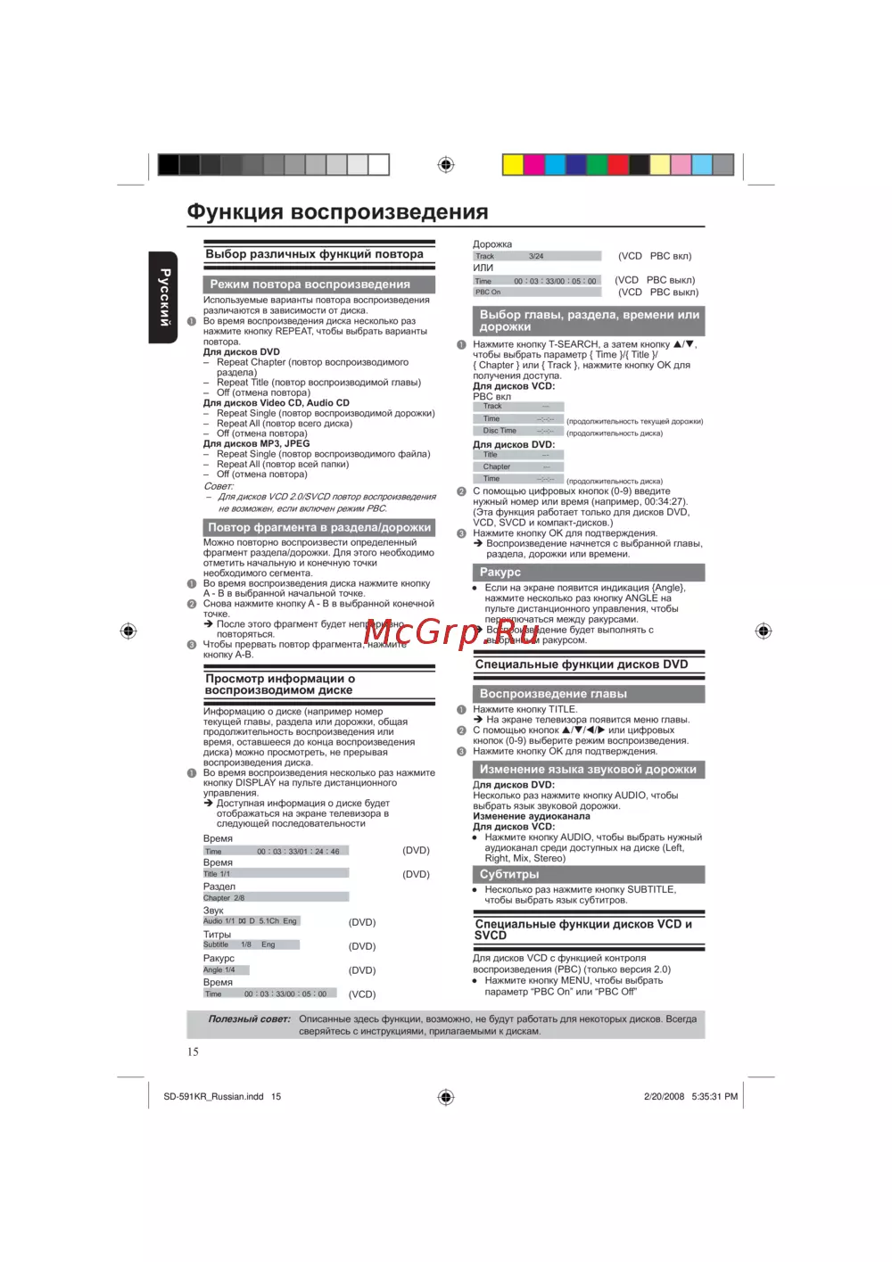 Узнайте о различных режимах повтора и управления воспроизведением для DVD, VCD и других дисков. Получите советы по использованию функций и настройкам.