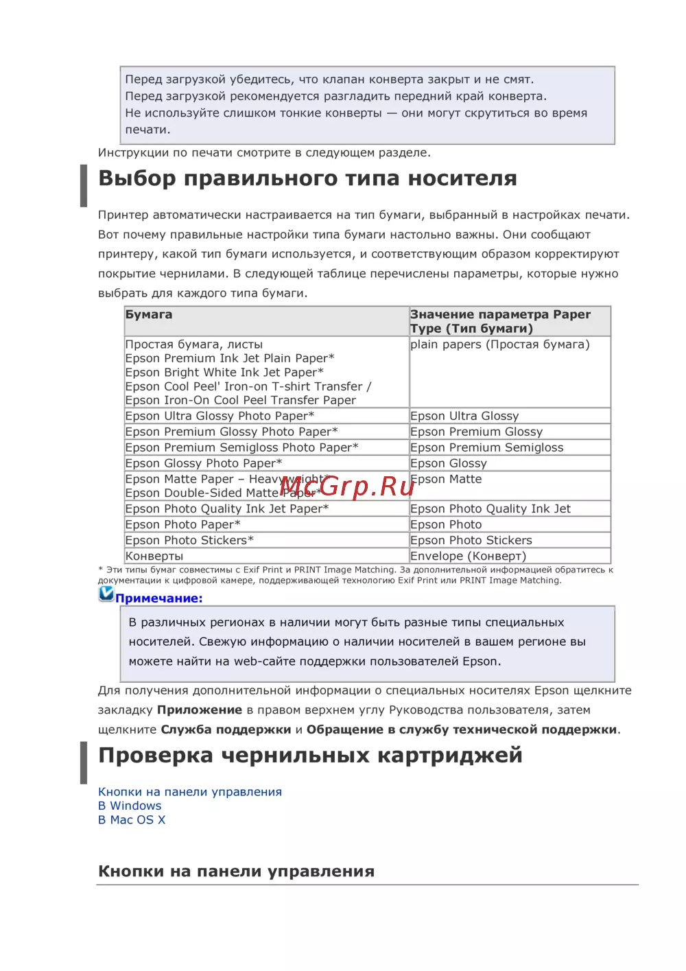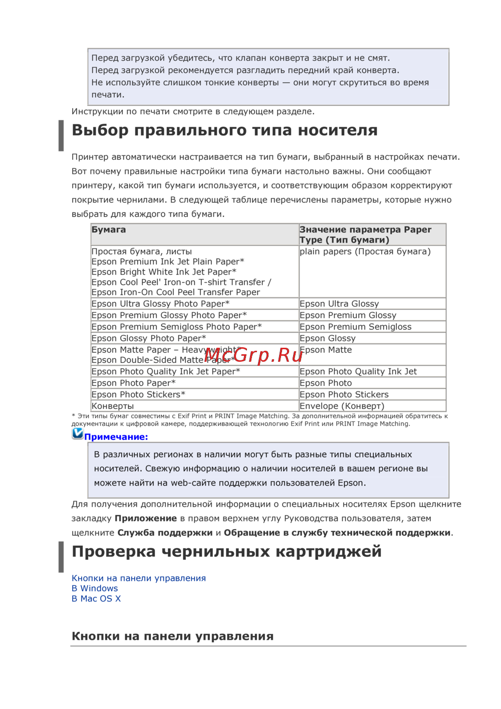 Для получения дополнительной информации о специальных носителях Epson щелкните