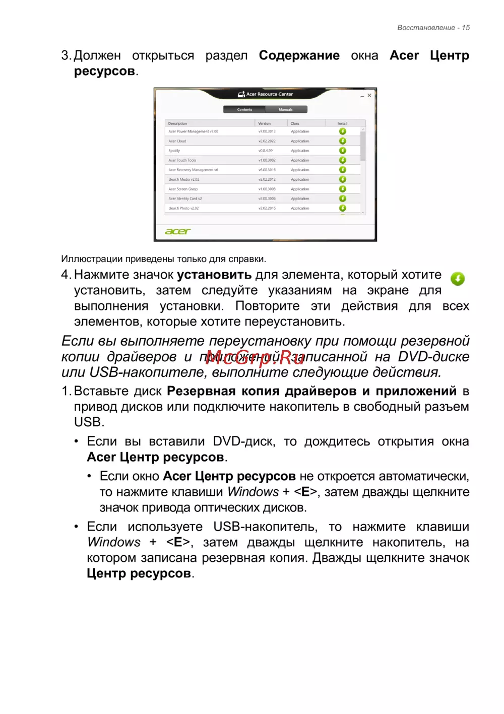 Acer aspire z3-710, dq.b04er.002 [15/72] Если вы выполняете переустановку при помощи резервной копии драйверов и приложений записанной на dvd диске или usb накопителе выполните следующие действия