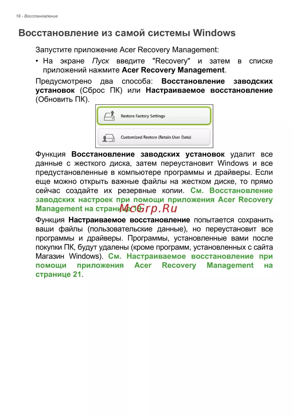 - Настраиваемое восстановление при помощи приложения acer recovery management p.21