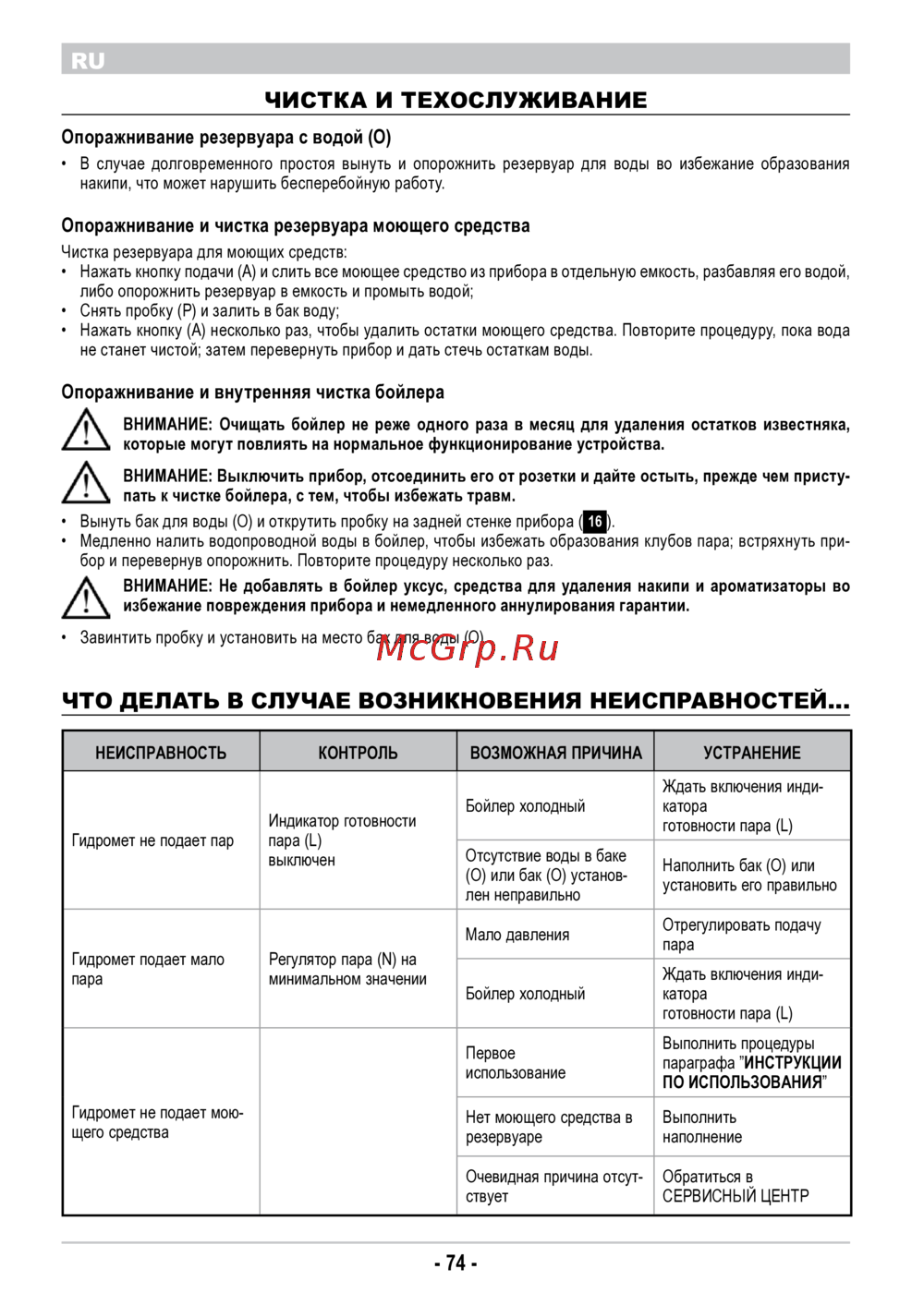 - Опоражниваниеичисткарезервуарамоющегосредства p.76