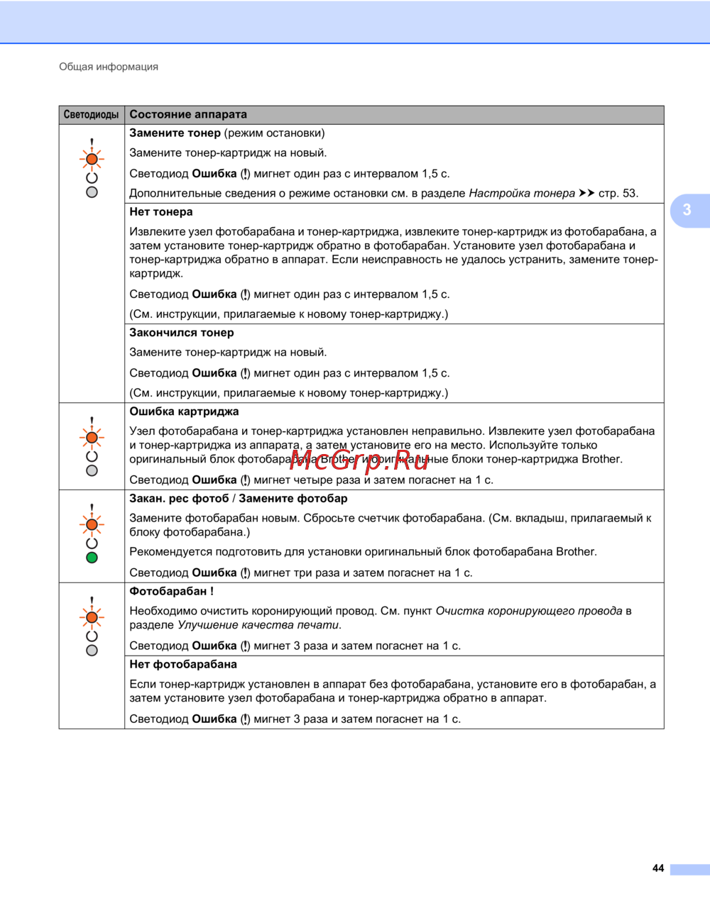 - Запишите показания светодиодов и сообщите об ошибке согласно таблице показания светодиодов об ошибке uu стр 46 в службу поддержки клиентов brother или местному дилеру brother p.52