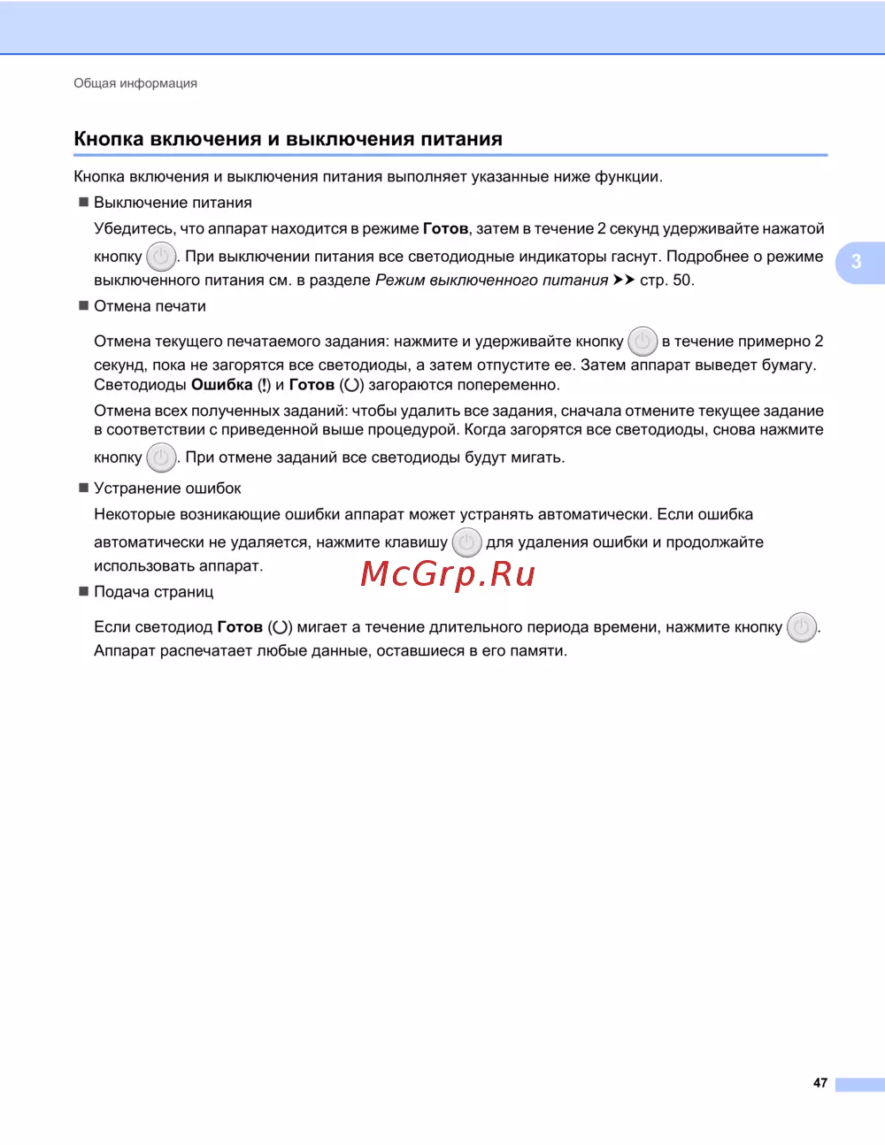 - Если состояние светодиодов на аппарате указывает на необходимость обращения в сервис как показано выше выключите аппарат на несколько секунд а затем снова включите и попробуйте выполнить печать p.52