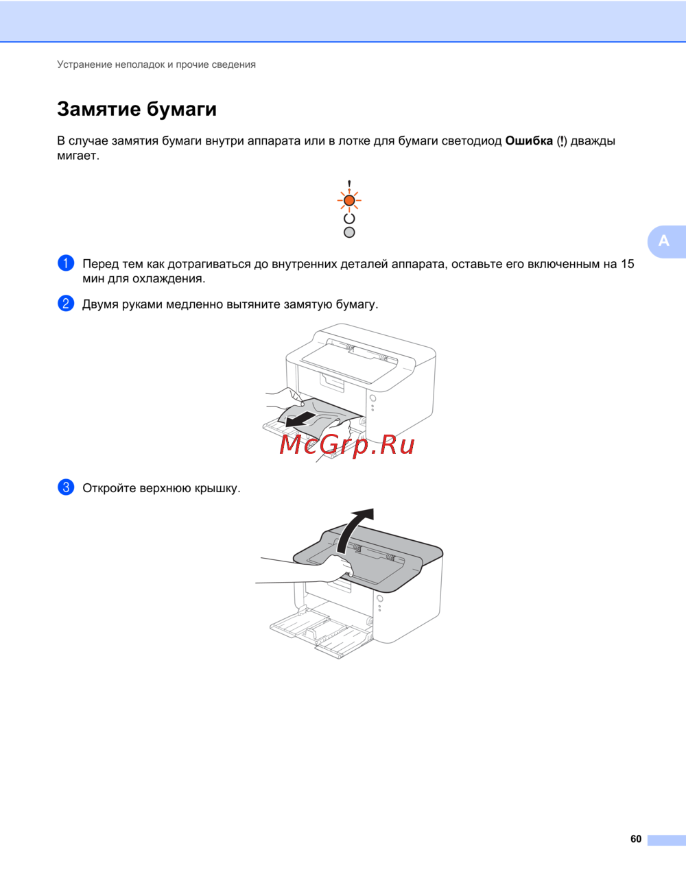 В случае замятия бумаги внутри аппарата или в лотке для бумаги светодиод Ошибка () дважды