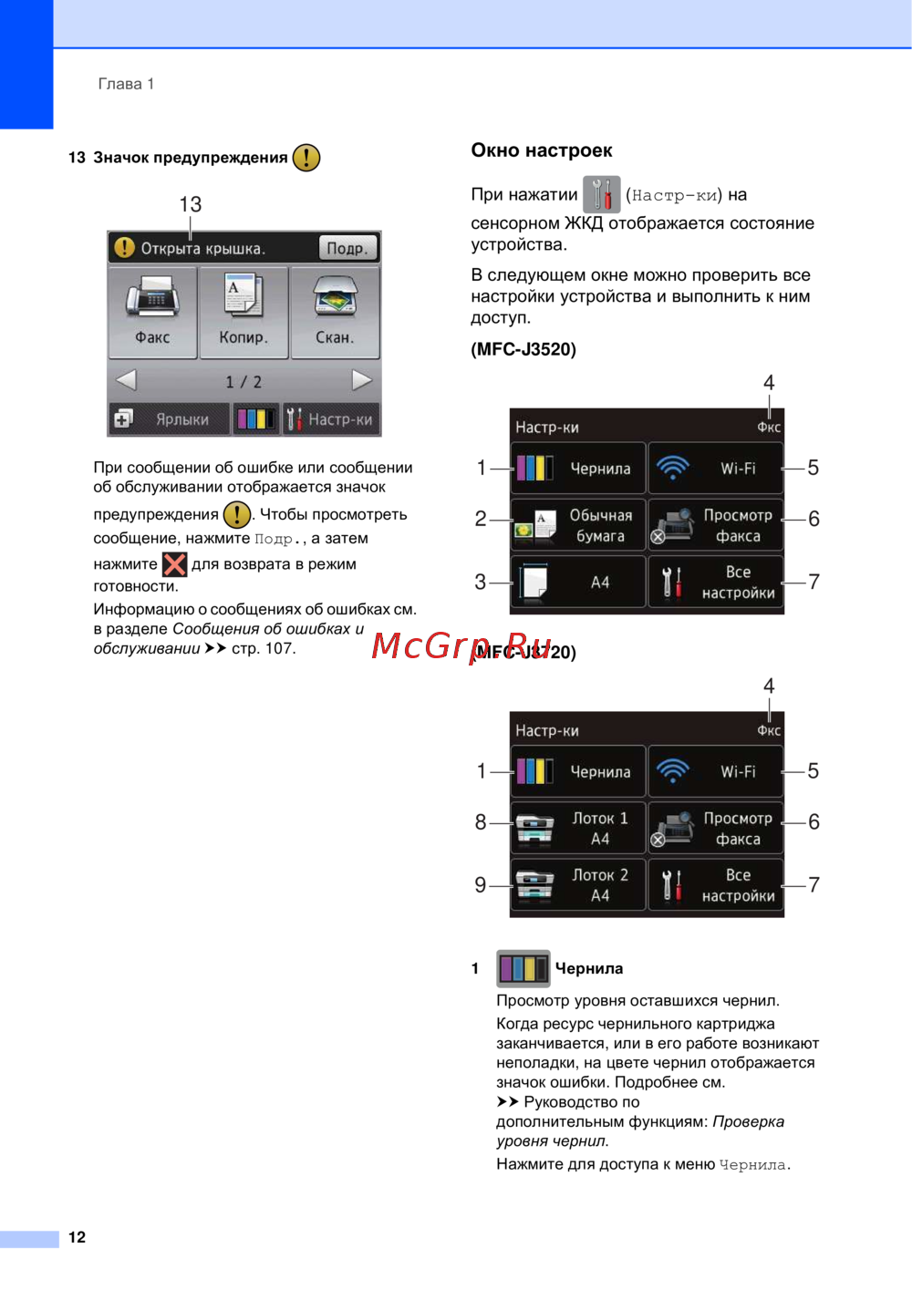 ![Brother mfc-j3520 [22/229] Сенсорном жкд отображается состояние устройства](/views2/1165269/page22/bg16.png)