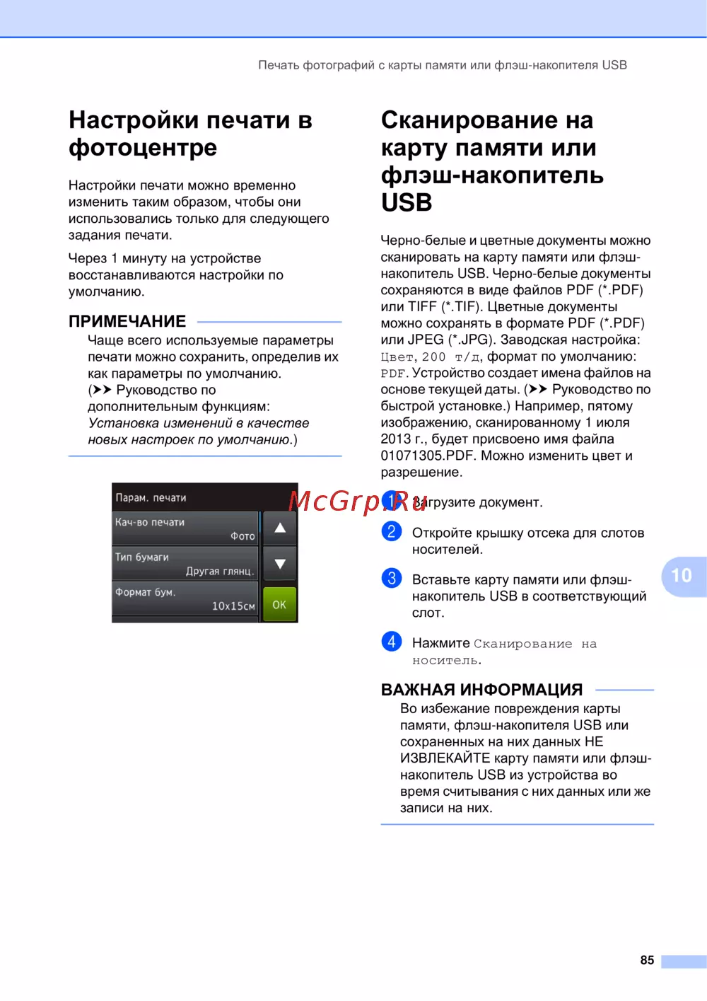 Узнайте, как печатать и сканировать документы с карт памяти и USB-накопителей. Настройте параметры печати и сохраните файлы в различных форматах.