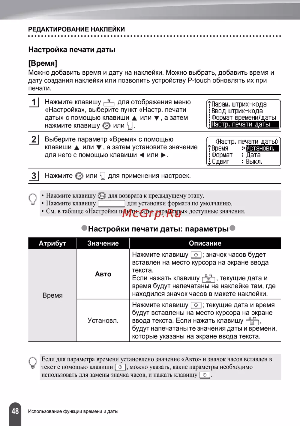 - Настройки печати даты параметр p.50
