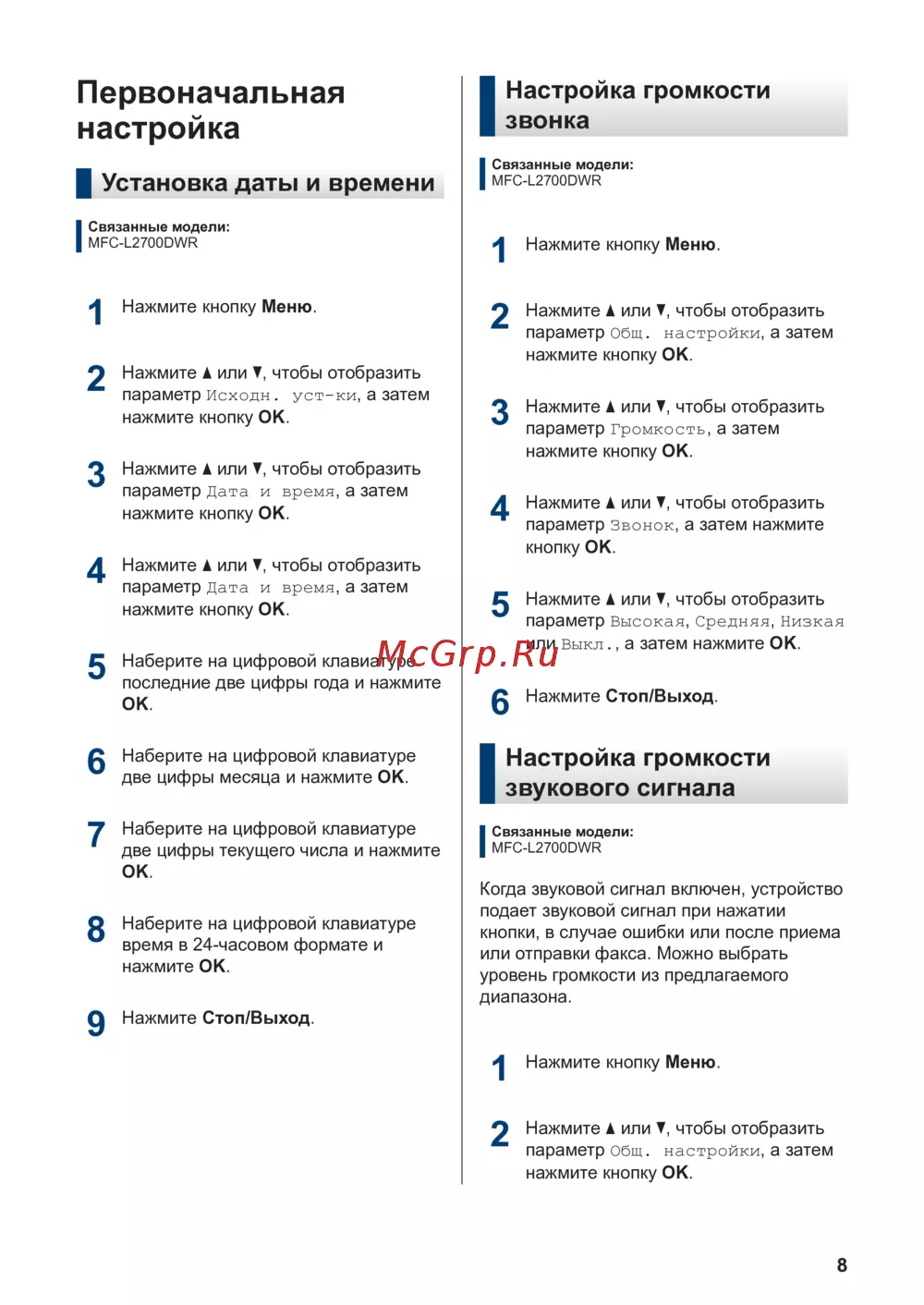 Brother MFC-L2700DNR — инструкция по первоначальной настройке устройства и громкости [20/82]