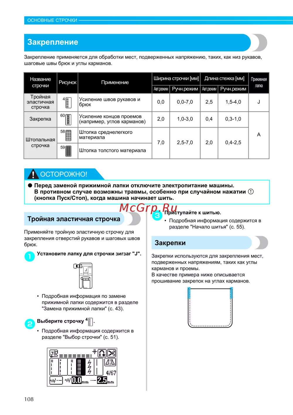 Узнайте о различных строчках для шитья, включая тройную эластичную строчку и закрепки. Подробные инструкции по применению и настройке швейной машины.