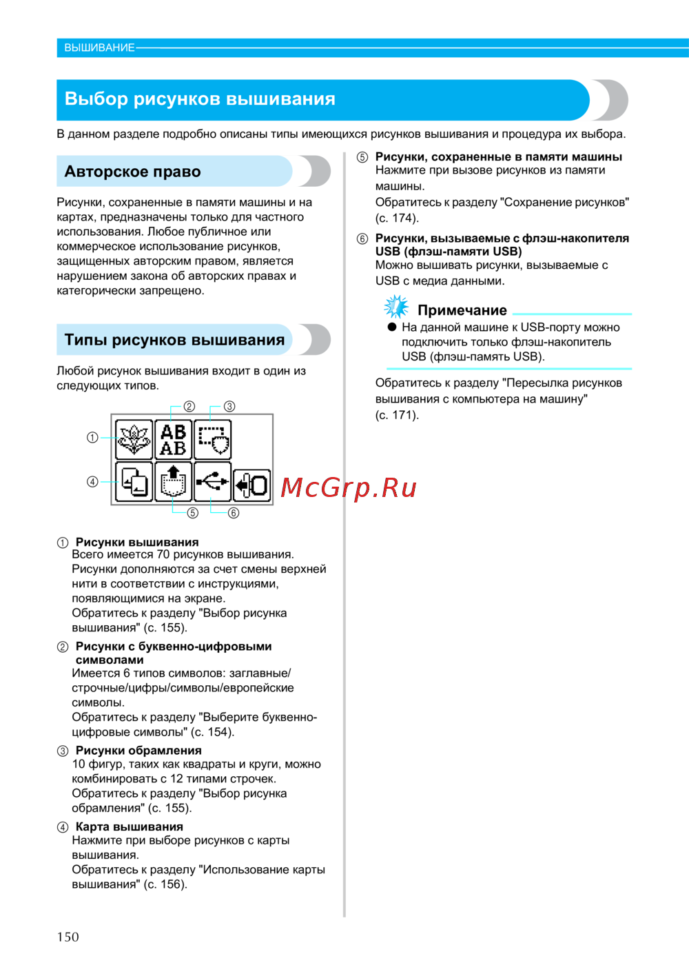 - Пересылка рисунков вышивания с компьютера на машину p.173