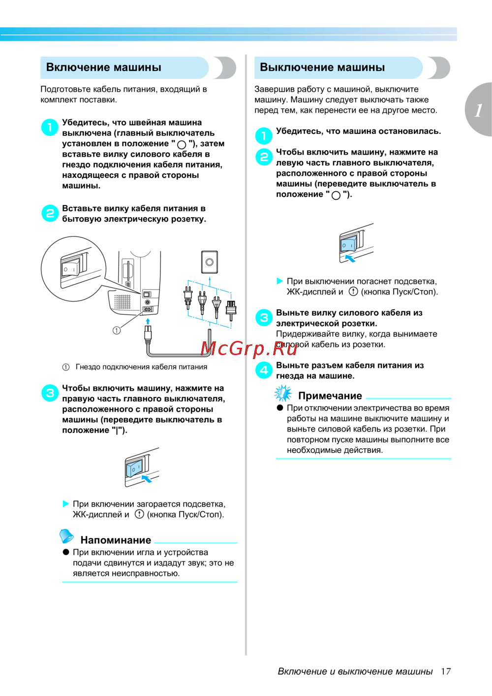 Узнайте, как правильно включать и выключать швейную машину. Следуйте простым шагам для безопасного использования и обслуживания устройства.