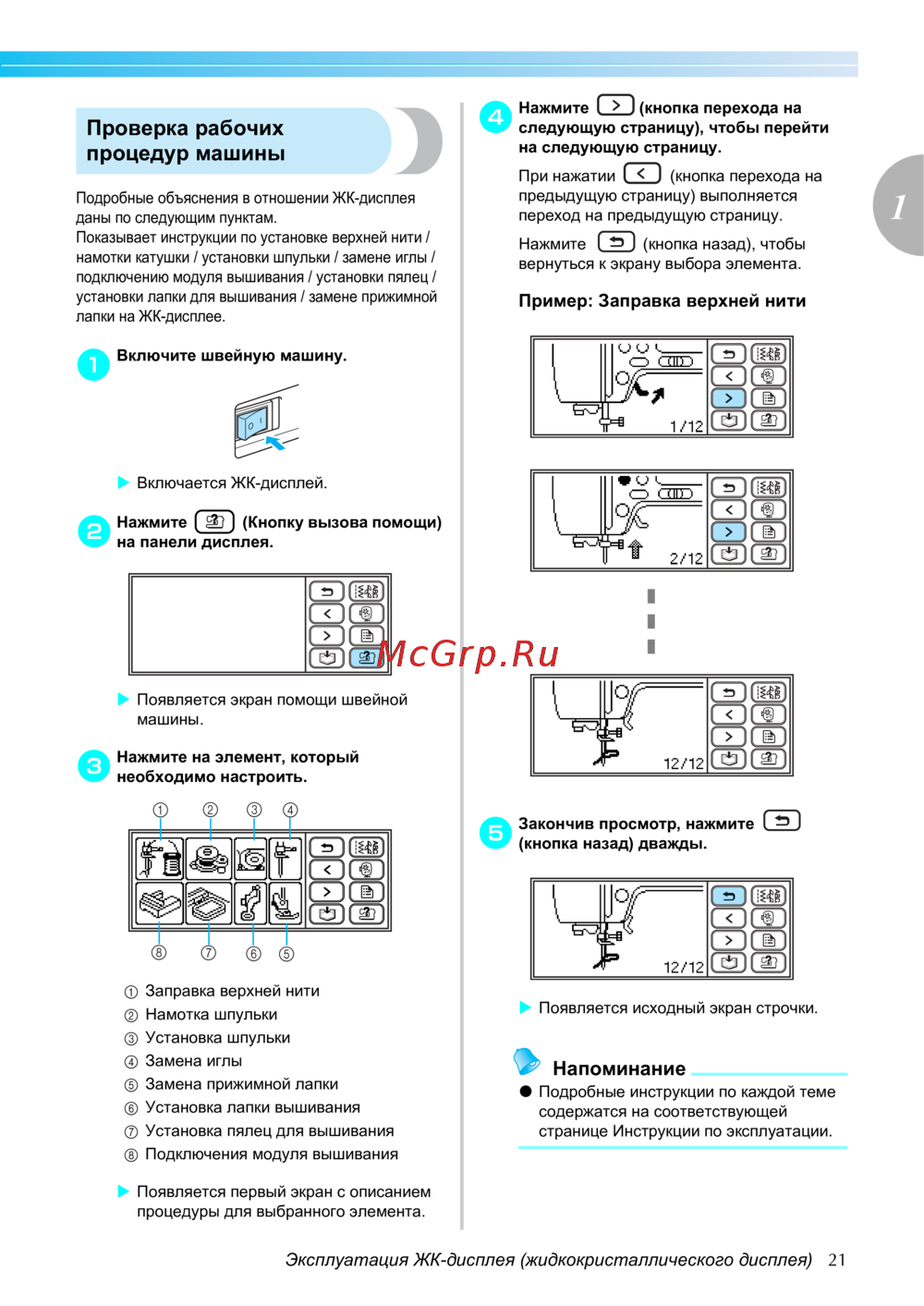Подробные инструкции по эксплуатации ЖК-дисплея швейной машины. Узнайте, как правильно заправлять нить, устанавливать шпульки и выполнять другие операции.