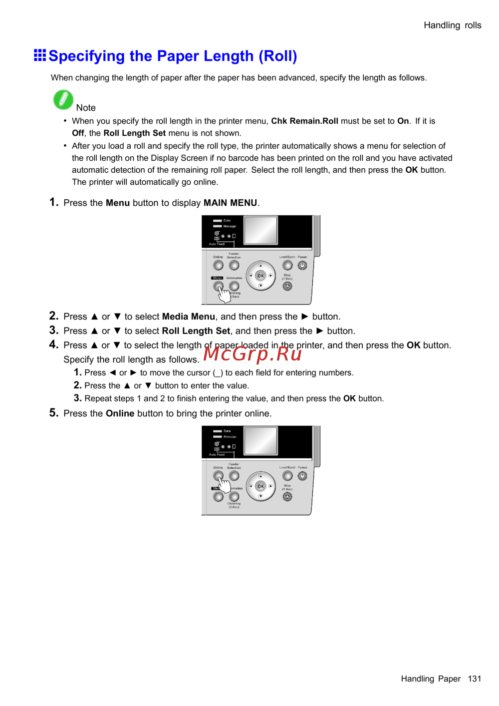 • When you specify the roll length in the printer menu, Chk Remain.Roll must be set to On . If it is