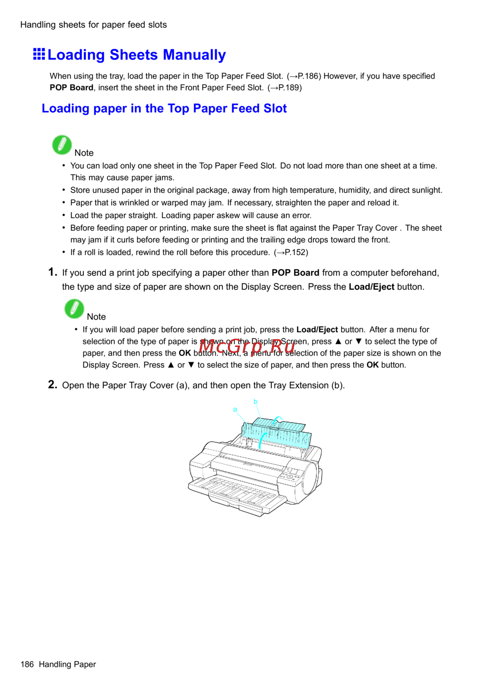 When using the tray , load the paper in the T op Paper Feed Slot . (→P .186) However , if you have specied
