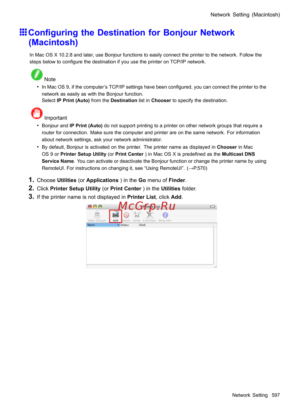 In Mac OS X 10.2.8 and later , use Bonjour functions to easily connect the printer to the network. Follow the