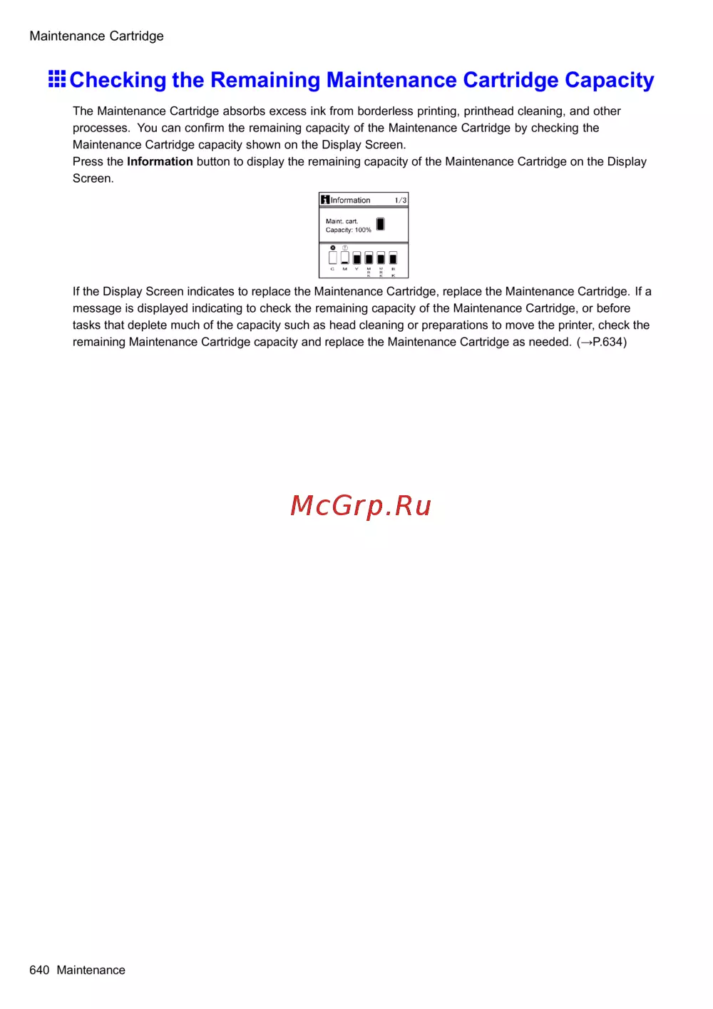 remaining Maintenance Cartridge capacity and replace the Maintenance Cartridge as needed. ( → P .634 )