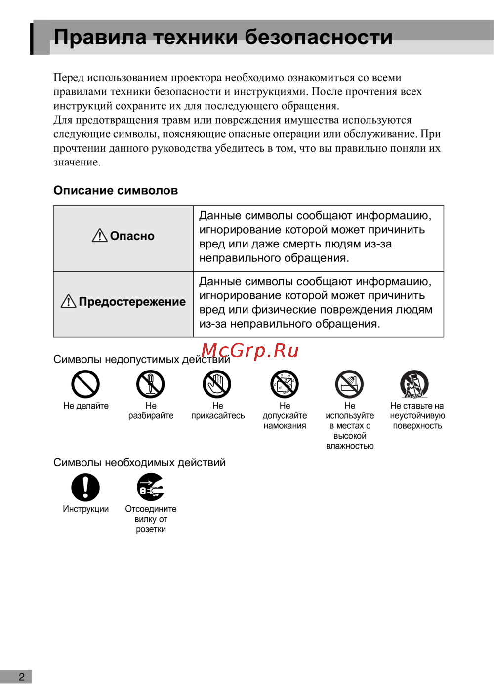 - Перед использованием проектора необходимо ознакомиться со всеми правилами техники безопасности и инструкциями после прочтения всех инструкций сохраните их для последующего обращения для предотвращения травм или повреждения имущества используются следующие символы поясняющие опасные операции или обслуживание при прочтении данного руководства убедитесь в том что вы правильно поняли их значение p.2