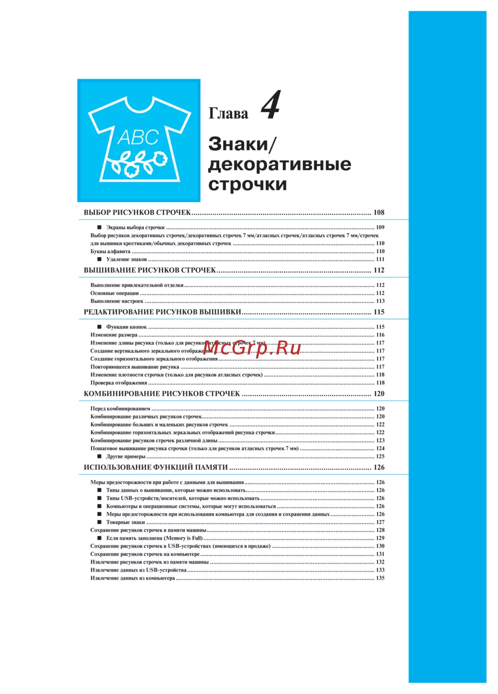 Пошаговое вышивание рисунка строчки (только для рисунков атласных строчек 7 мм) .............................................. 124