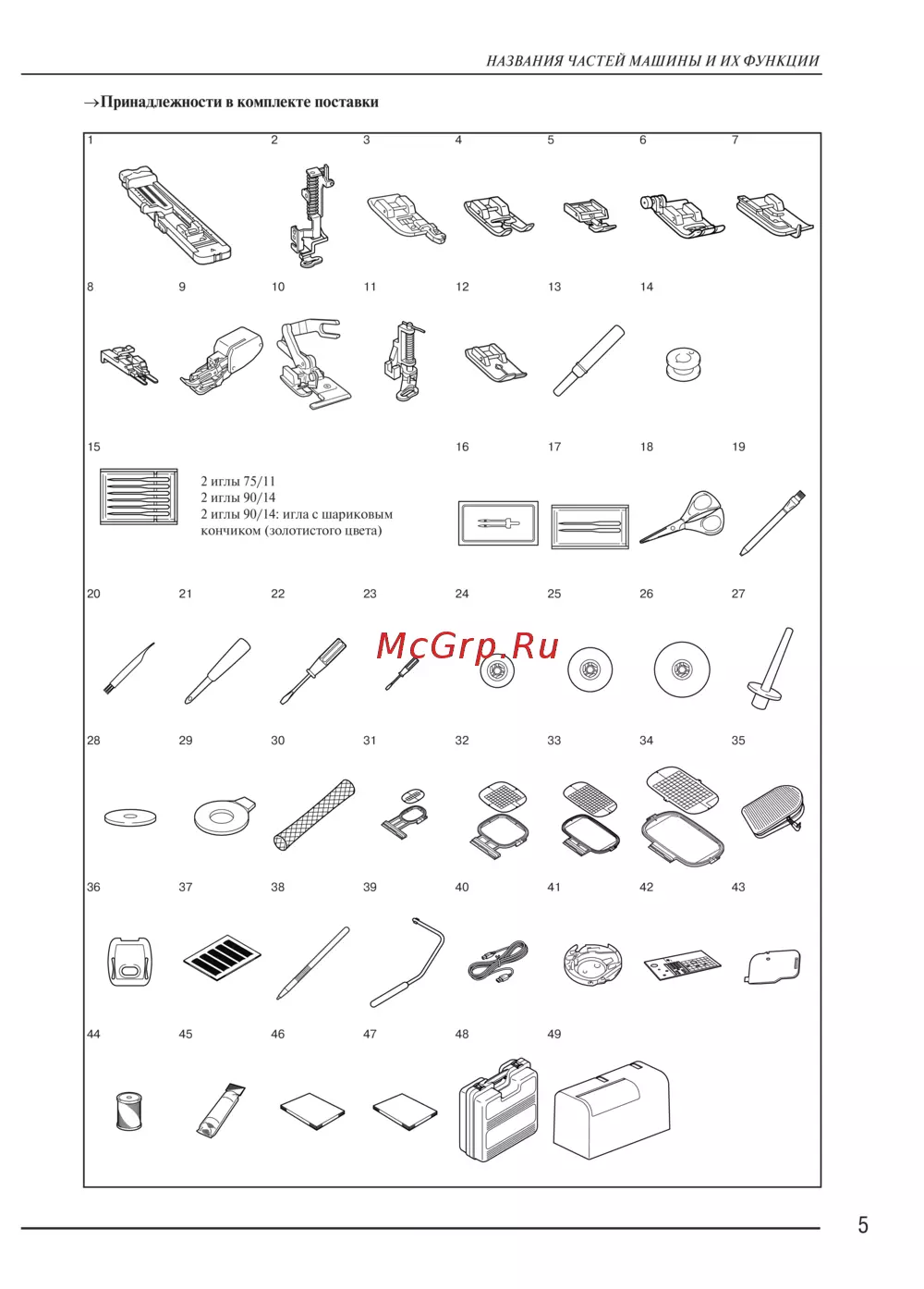 - Используйте только те принадлежности которые рекомендованы для данной машины винт крепления адаптера прижимной лапки можно приобрести у уполномоченного дилера компании код изделия xa4813 051 входящие в комплект поставки принадлежности 35 46 и 47 могут храниться в жестком футляре машины p.15