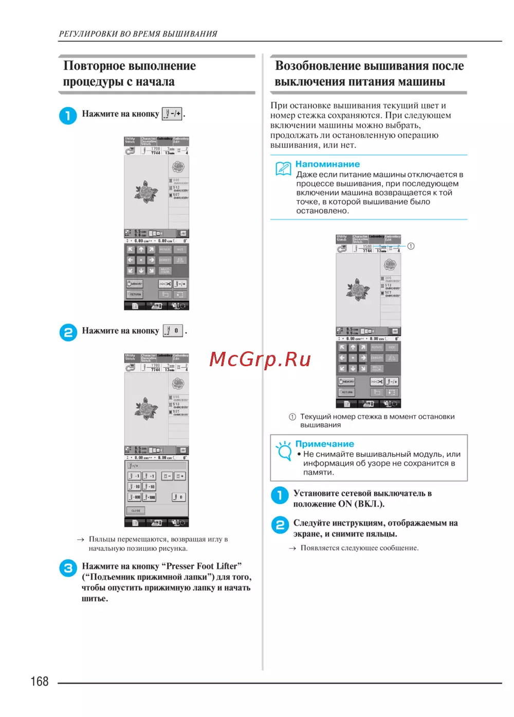 - А затем на кнопку можно во время шитья получить рекомендации по решению незначительных проблем для возврата к первоначальному экрану в любой момент нажмите на p.245